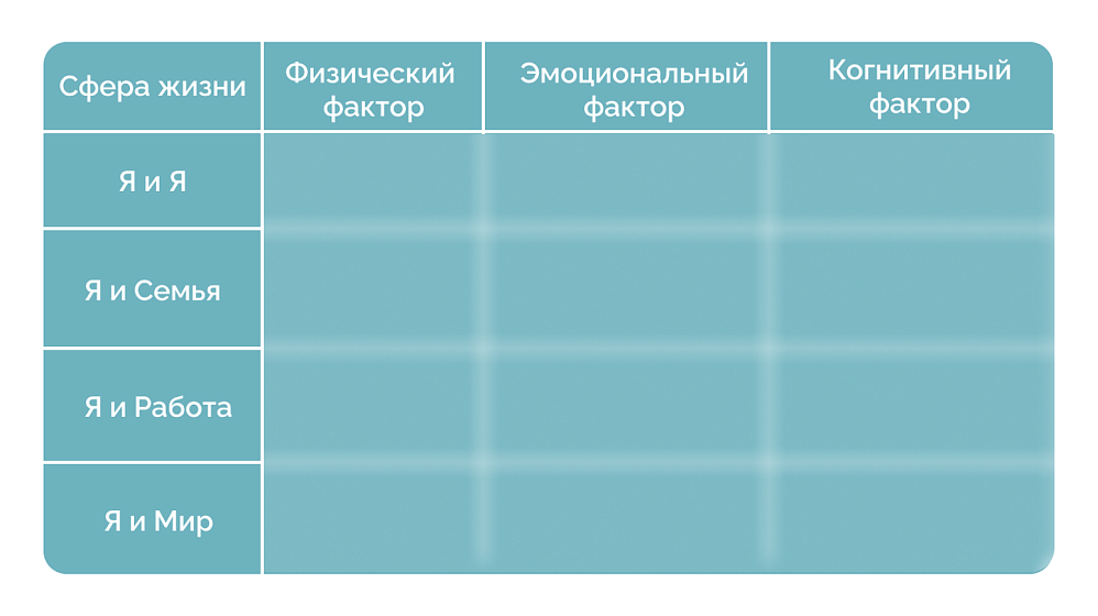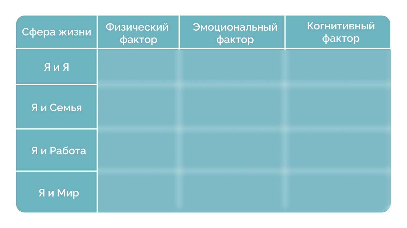 Мы увидели подтверждение этому в небольшом дополнительном исследовании. Сотрудники Медцентра, которые оказались в зоне риска по выгоранию, прошли также интервью по технологии «ТЕМП». Интервью оценивает четыре сферы жизни человека («Я сам», семья, работа, мир в целом) по трём факторам (физический, эмоциональный и когнитивный).