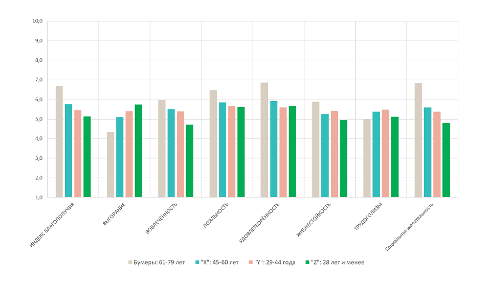 Визуально заметно снижение баллов от старших к младшим поколениям по общему индексу благополучия и отдельным метрикам, в частности, вовлечённости. Нарастание результата от старших к младшим видно для показателя профессионального выгорания.