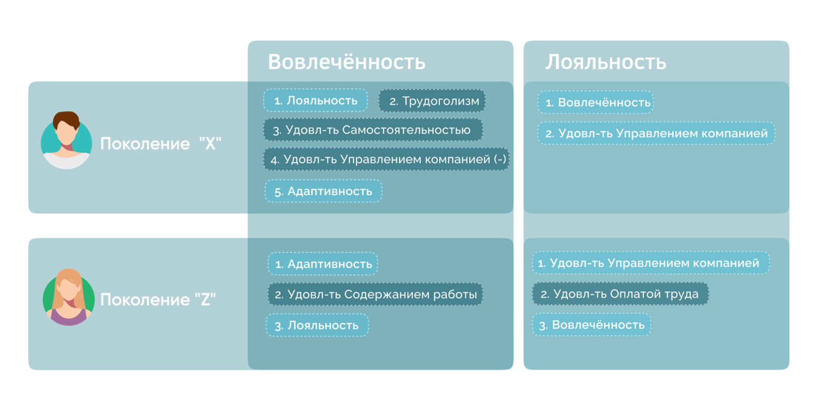 Переходим к ещё более интересному: есть ли содержательная разница в формировании вовлечённости у представителей разных поколений? От чего зависят вовлечённость и лояльность у старших и младших?