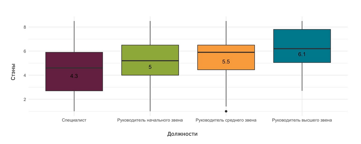 Таблица 1. Описательные статистики по мотивационным шкалам на 4-х уровнях должностей. Данные в ячейках представлены в шкале стэнов в формате среднее/стандартное отклонение.