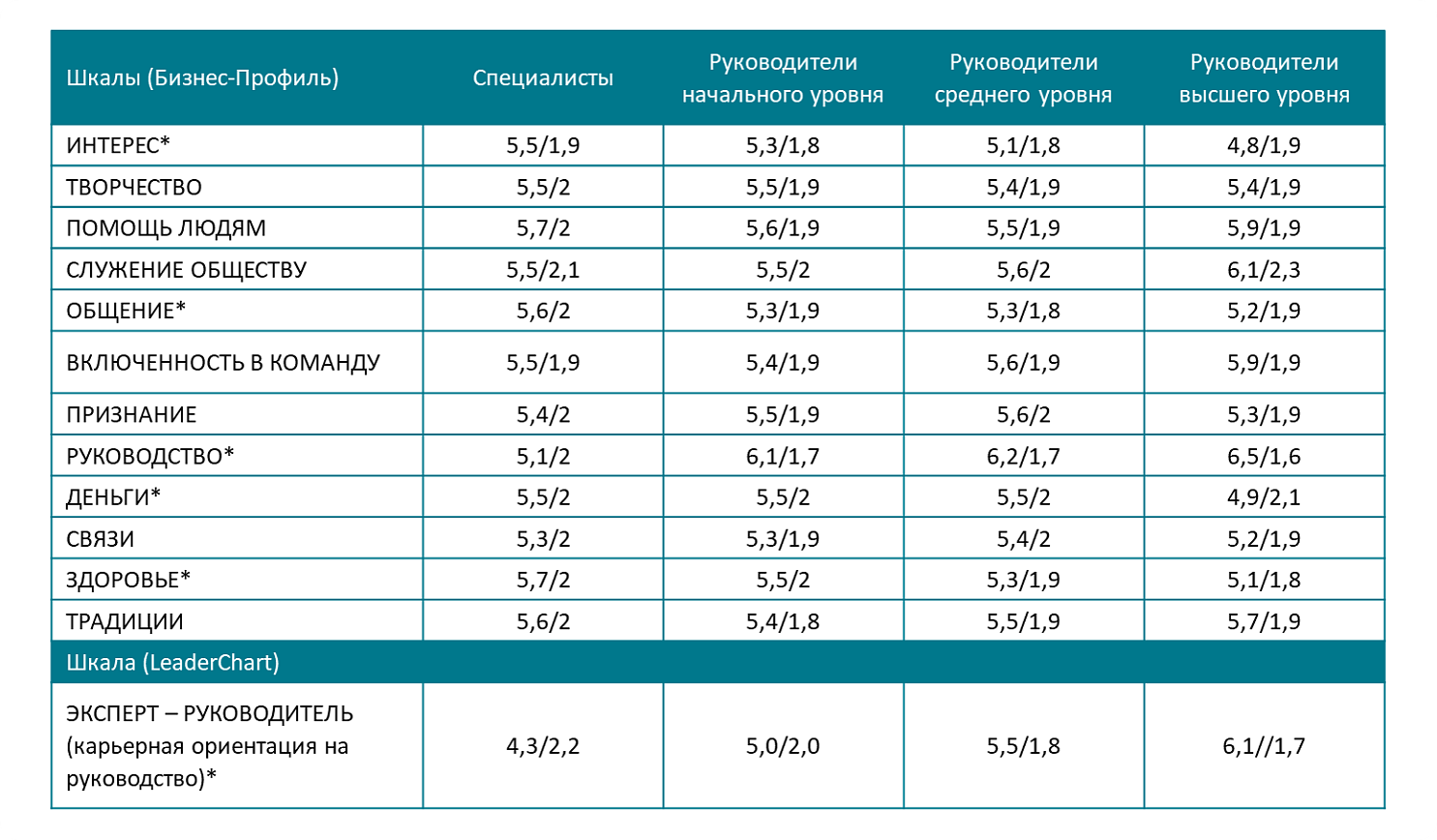 В таблице 1 приведены средние баллы по мотивационным факторам в каждой из 4‑х групп должностей: специалистов, руководителей начального уровня, руководителей среднего звена и топ-руководителей. Звёздочкой возле названия шкалы обозначены те шкалы, по которым обнаружены значимые различия.