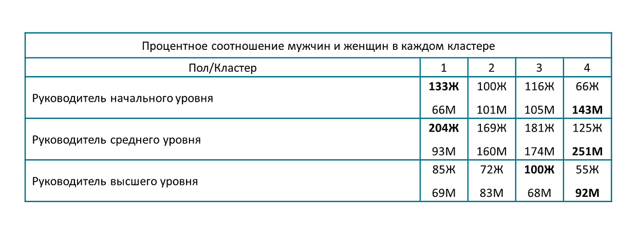 Таблица 4. Процентное соотношение мужчин и женщин в каждом кластере
