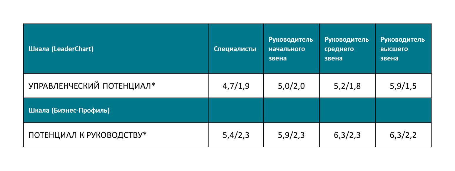 Для удобства интерпретации полученных результатов в методиках «Бизнес-Профиль» и «LeaderChart» выводятся дополнительные итоговые шкалы управленческого потенциала. Баллы по этим шкалам рассчитываются с опорой на сочетание значимых шкал из блоков мотивации, способностей и личностных качеств. Анализ баллов по таким интегральным шкалам показывает существенный прирост балла по мере роста уровня должности (см. таблицу 5).