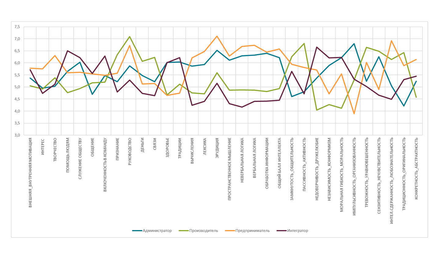 С другой стороны, разнообразие профилей здесь существенно шире, чем при анализе профилей мотивации и интеллекта. Такое разнообразие позволяет выделять различные стили или «типажи» управленцев, каждый из которых может быть не просто пригоден, но и успешен в роли руководителя.