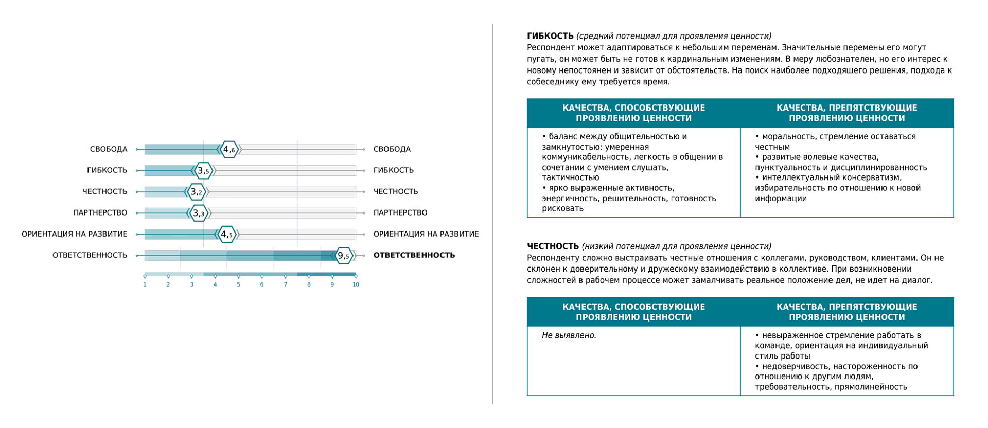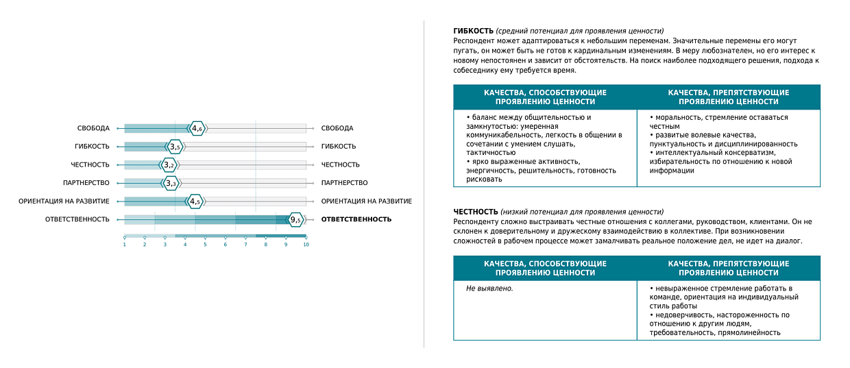 В качестве базового инструмента оценки выбран тест «Бизнес-Профиль Express». Он оценивает личностные особенности человека, его мотивацию и помогает делать дополнительные прогнозы на основе комбинации факторов. Для более точной оценки ценности «Ответственность» (как её понимает заказчик) в тест добавлена дополнительная шкала «Проактивность».