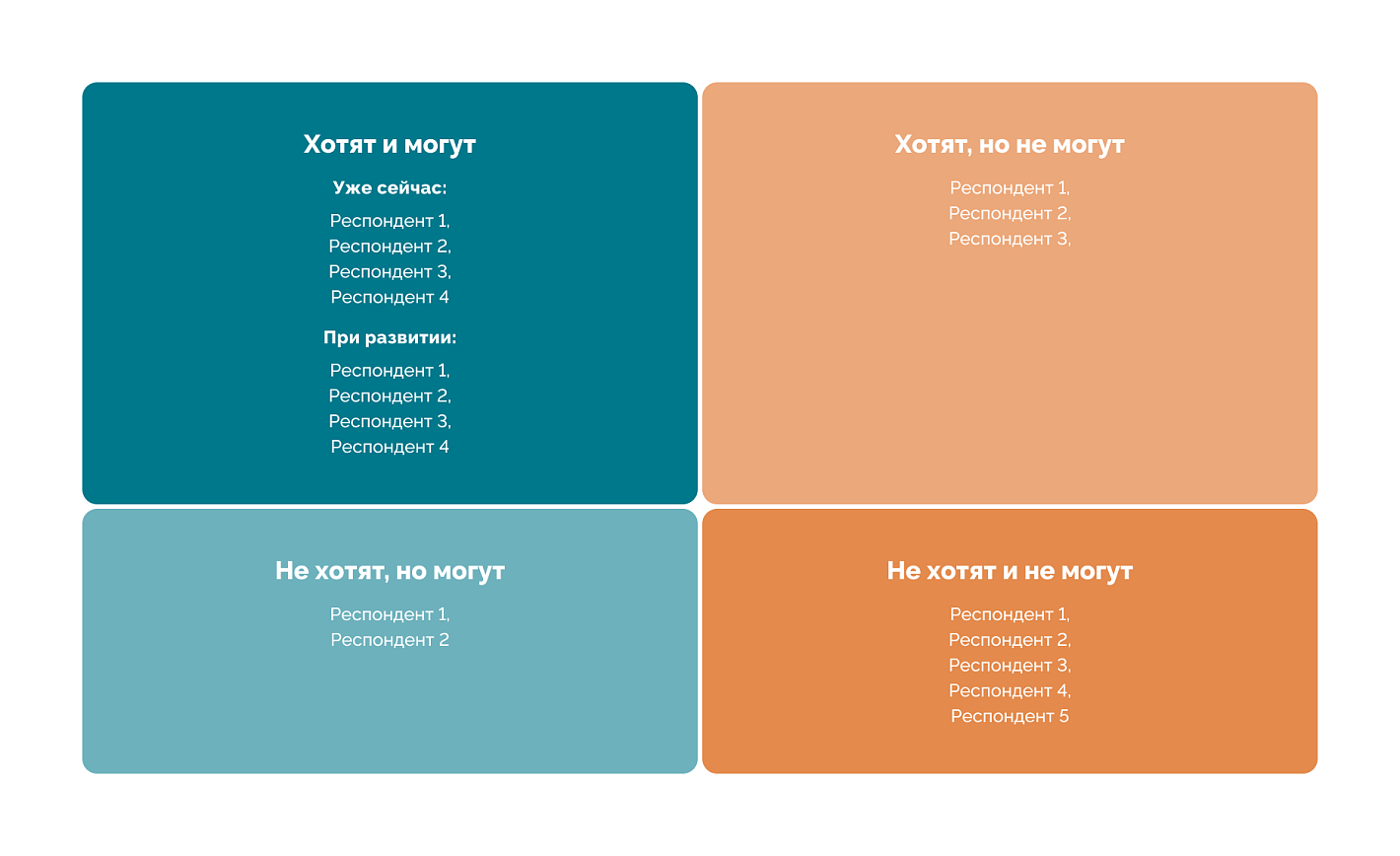 Данные анализировались по двум направлениям, чтобы предоставить и персональную дорожную карту каждому респонденту (индивидуальные результаты), и стратегическую — бизнесу (групповые результаты).