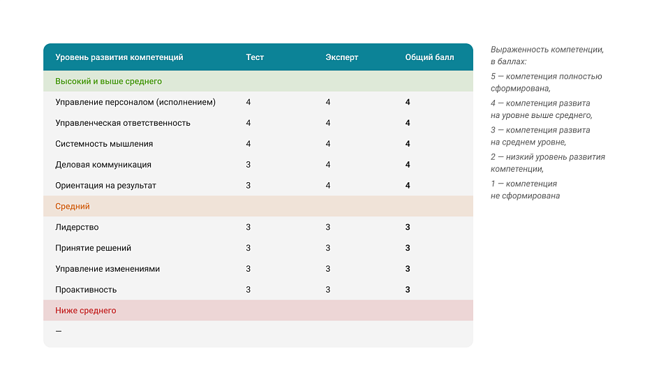 - На основе интегральных оценок менеджеры разделены на три категории: «крепкие» по компетенциям — опора команды с высоким уровнем компетенций, «на вырост» — ядро команды со средним уровнем и потенциалом к развитию, «слабые» по компетенциям — сотрудники с низким уровнем по ряду критических управленческих компетенций.