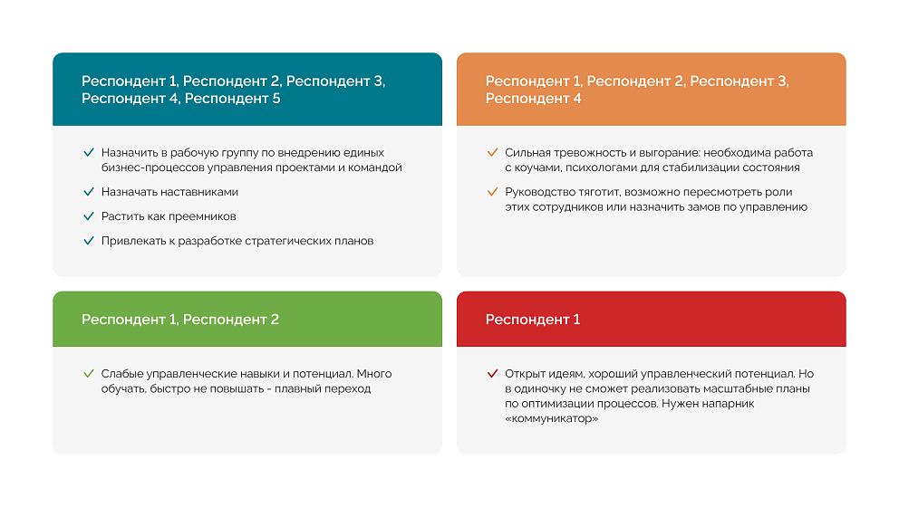 Таким образом, групповой анализ дал руководству не просто цифры, а целостную картину: данные по управленческому потенциалу сотрудников для точечных решений и список системных рисков, которые требуют организационных изменений. Эти выводы стали основой для итоговой презентации и дорожной карты.