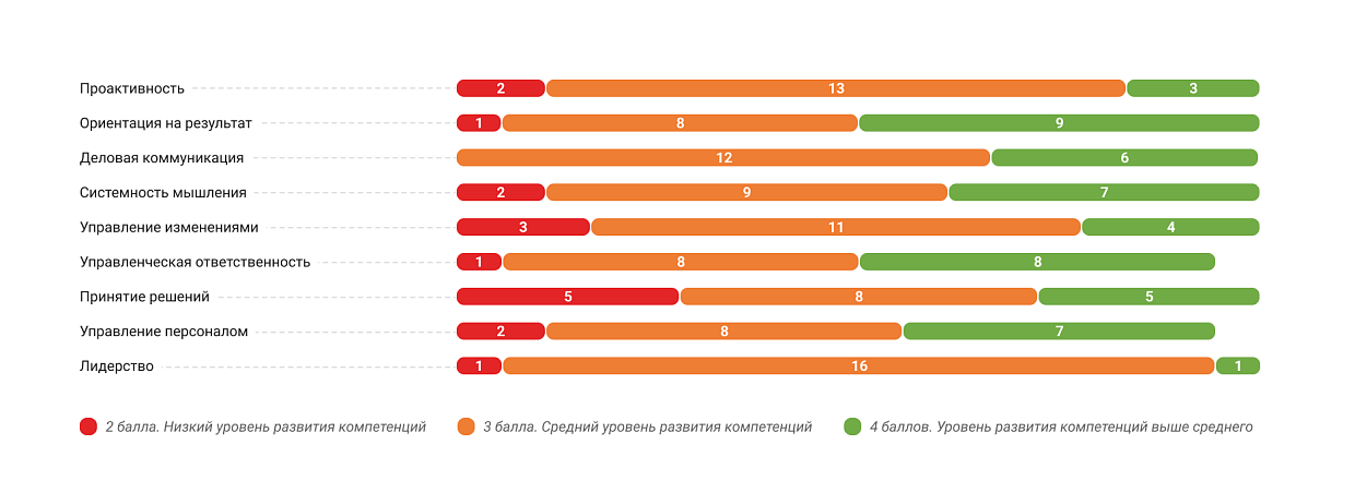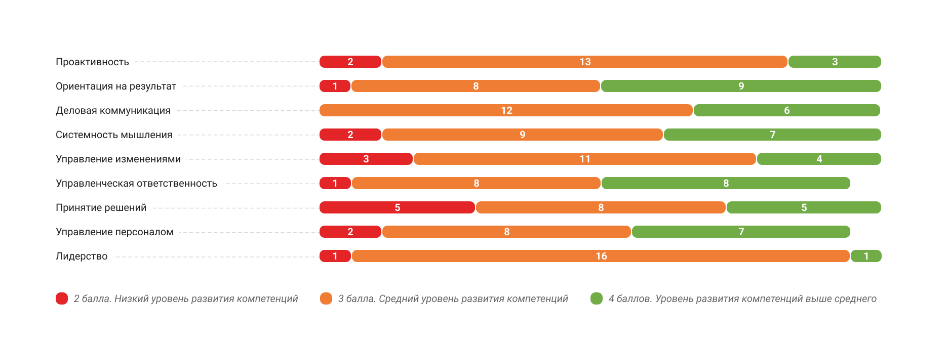 Построена общая шкала, которая демонстрирует «температуру» команды. Выяснилось, что у группы сильно развиты компетенции «Управленческая ответственность», «Системное мышление» и «Ориентация на результат». Это создаёт прочную основу для развития. Однако для перехода на новый уровень команде необходимо усилить базовые управленческие навыки — «Принятие решений» и «Лидерство».