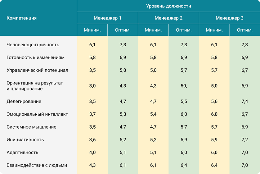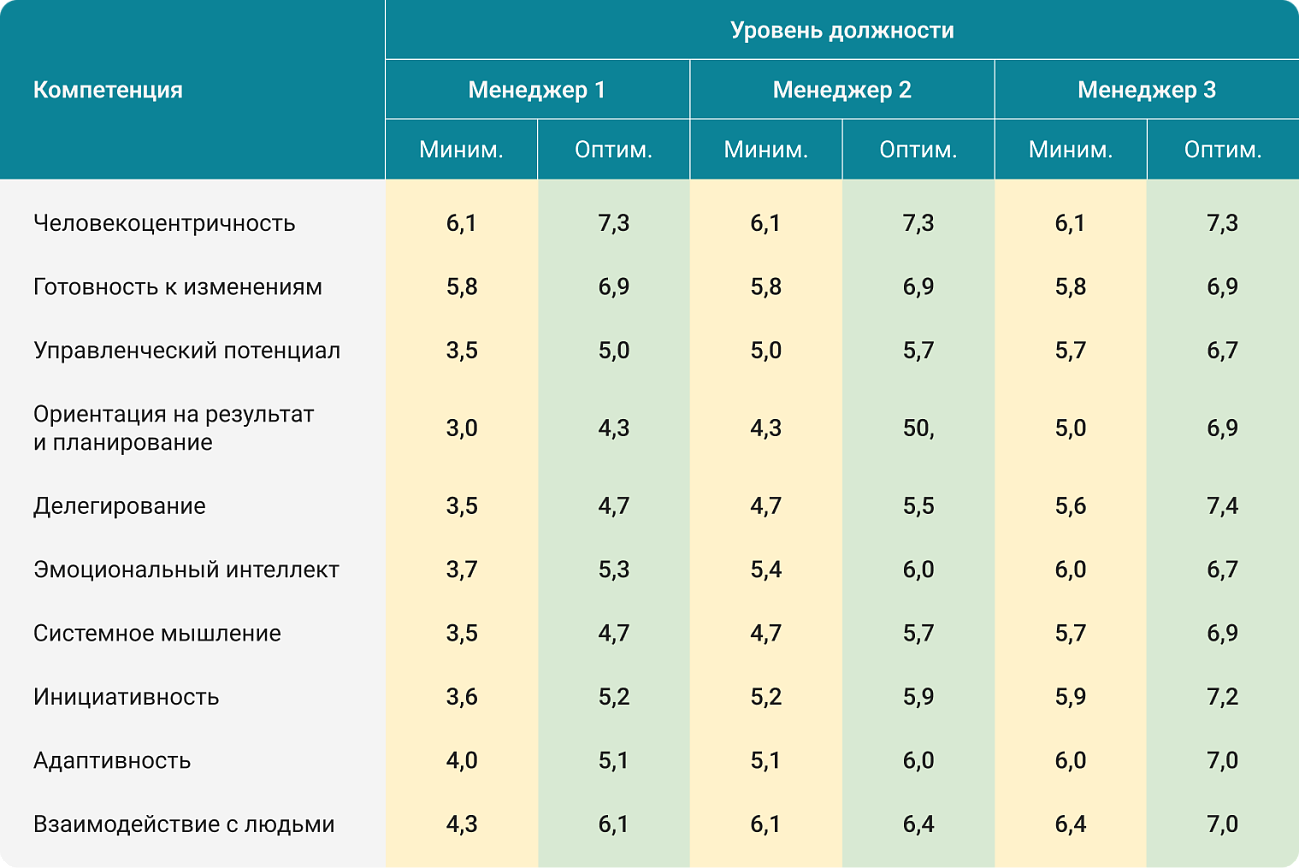 Табл.1. Пример минимальных и оптимальных баллов по компетенциям для трёх уровней должностей