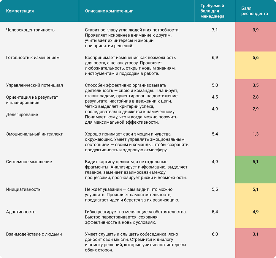 - балл респондента с цветовой индикацией (красный / жёлтый / зелёный).