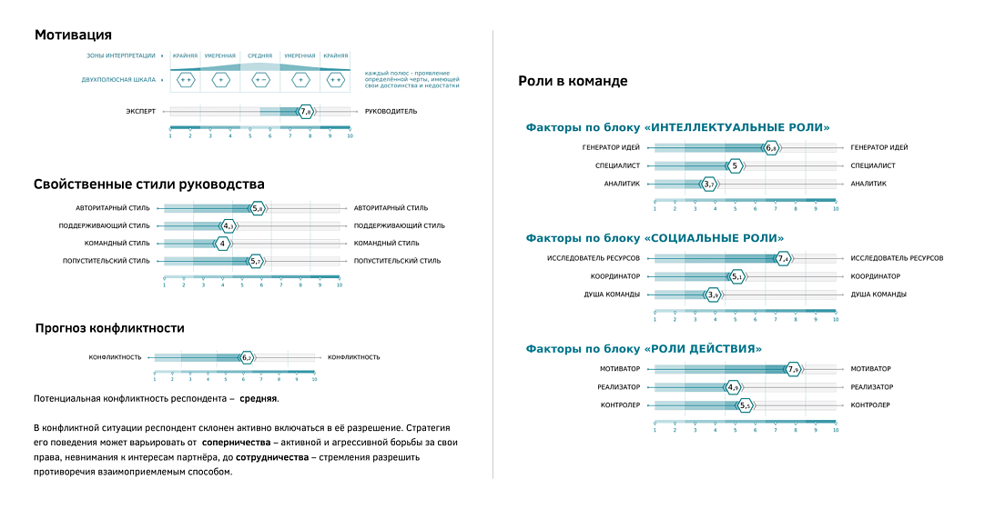 По сути, это было одностраничное изложение ключевых результатов оценки, где сразу можно понять главное о респонденте. А при необходимости можно обратиться к полному отчёту результатов тестирования и изучить детали.